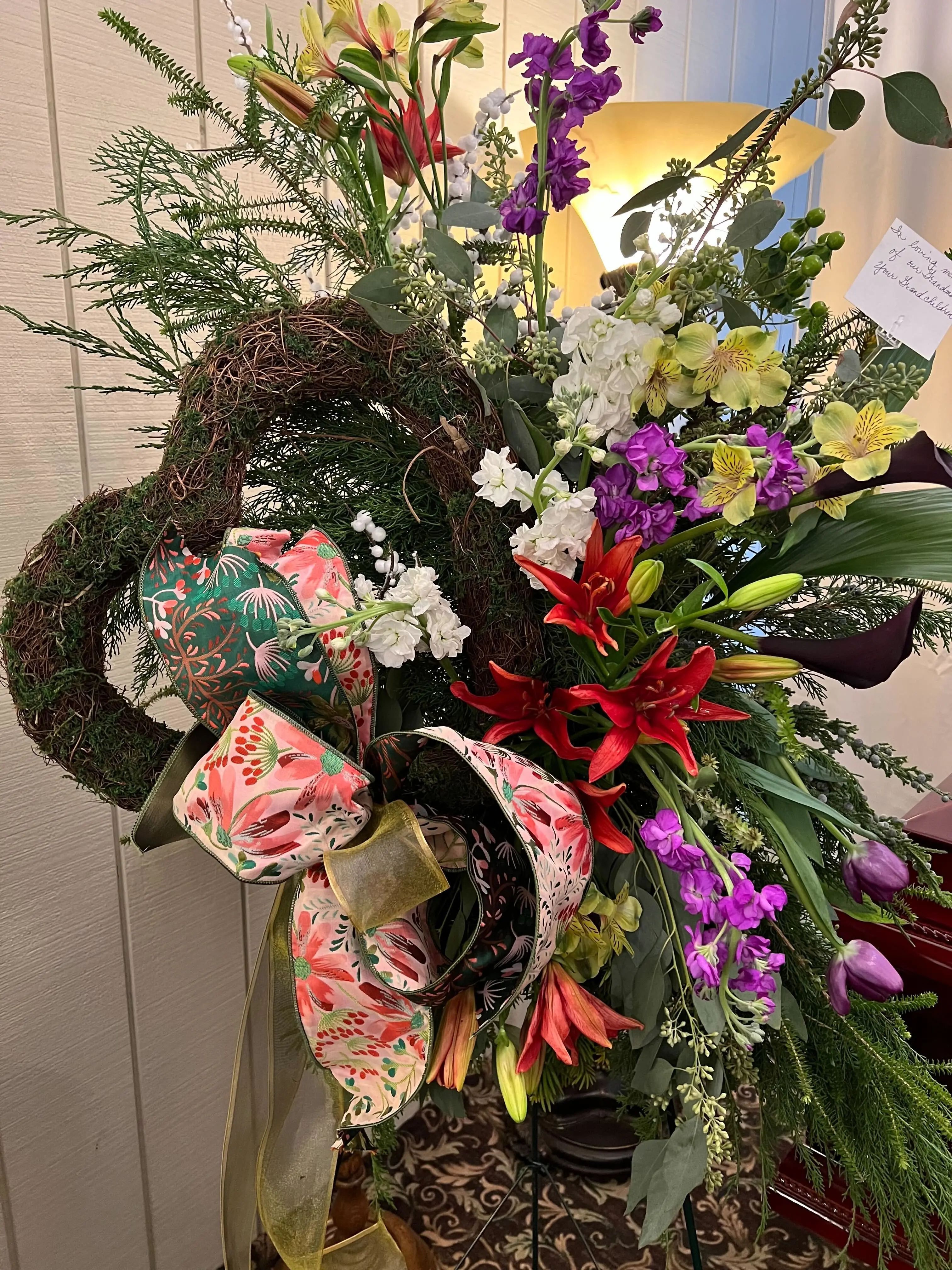 This large, expressive spray is designed around a natural moss and grapevine heart. It features a vibrant cascading display of deep red, purple, and white blooms mixed with lush evergreens and finished with a grand, decorative floral ribbon.