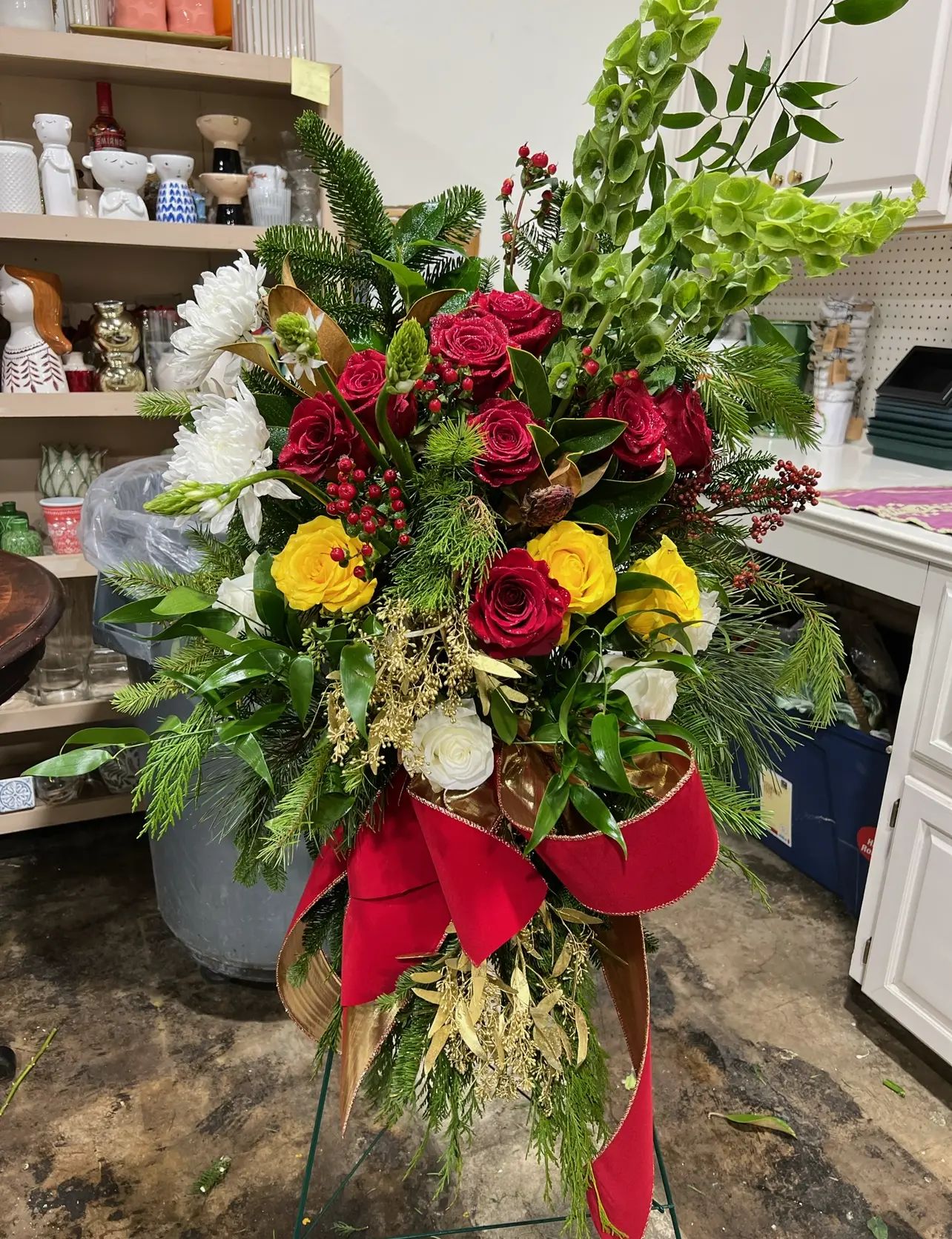 This tall, festive spray features a rich palette of deep red and bright yellow blooms set against a backdrop of crisp white flowers. It is lushly framed by seasonal evergreens and unique green bells, finished with a classic velvet ribbon and shimmering gold accents.