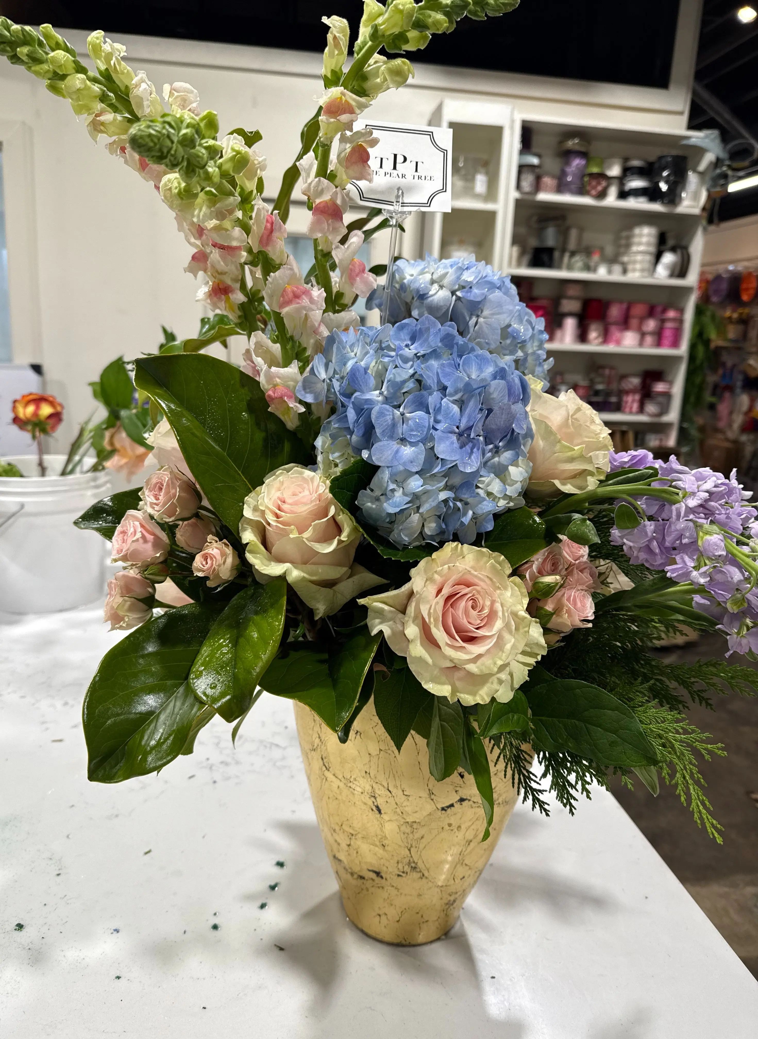 A Unique arrangement created in a gold Vietri Vase with Hydrandgeas, Roses, Spray Roses, Stalk and Snap Dragons