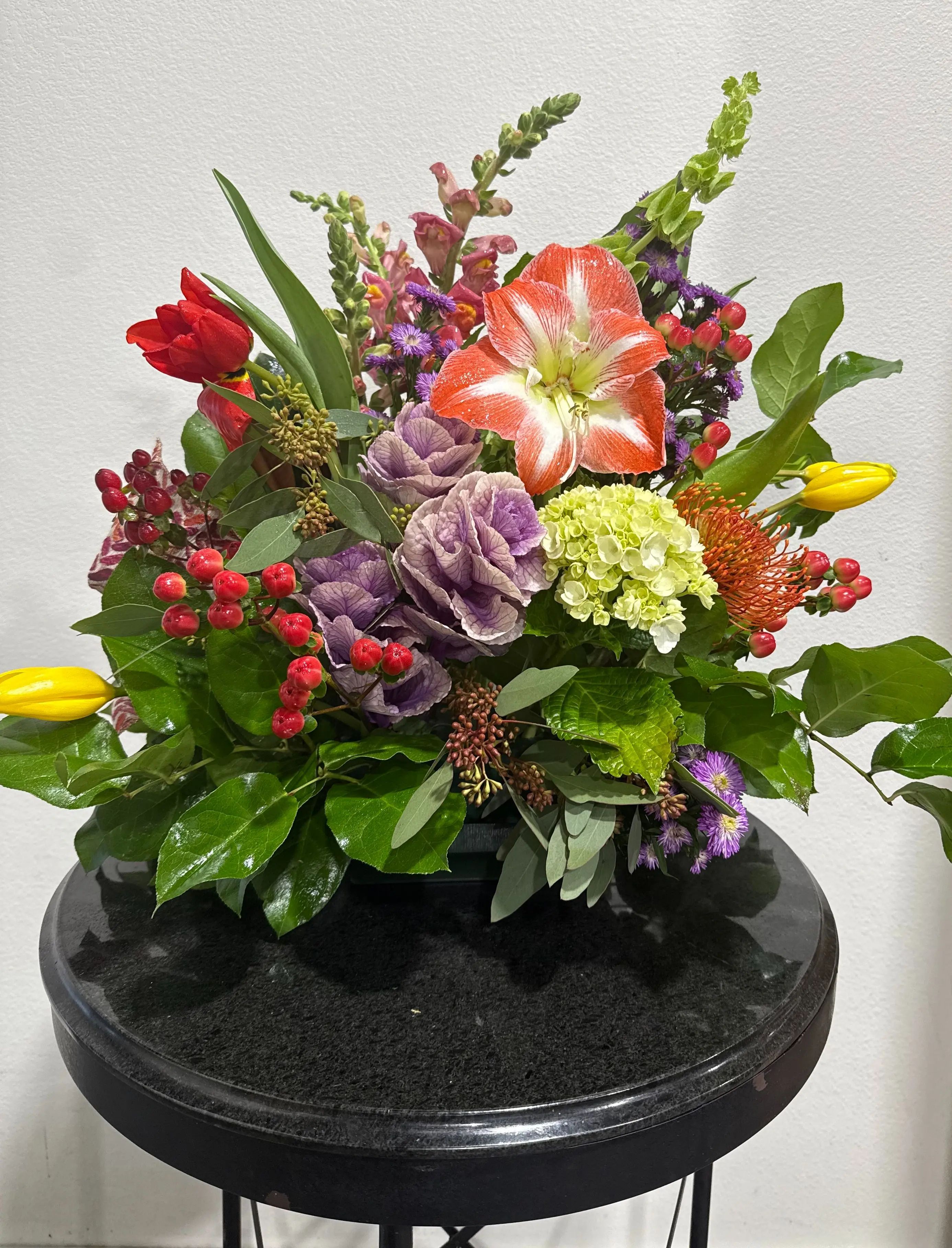 A vibrant mixed floral arrangement featuring seasonal blooms in red, orange, yellow, purple, and green tones. Designed with a variety of fresh flowers and lush foliage for a full, natural look. Perfect for brightening any space or marking a special occasion.