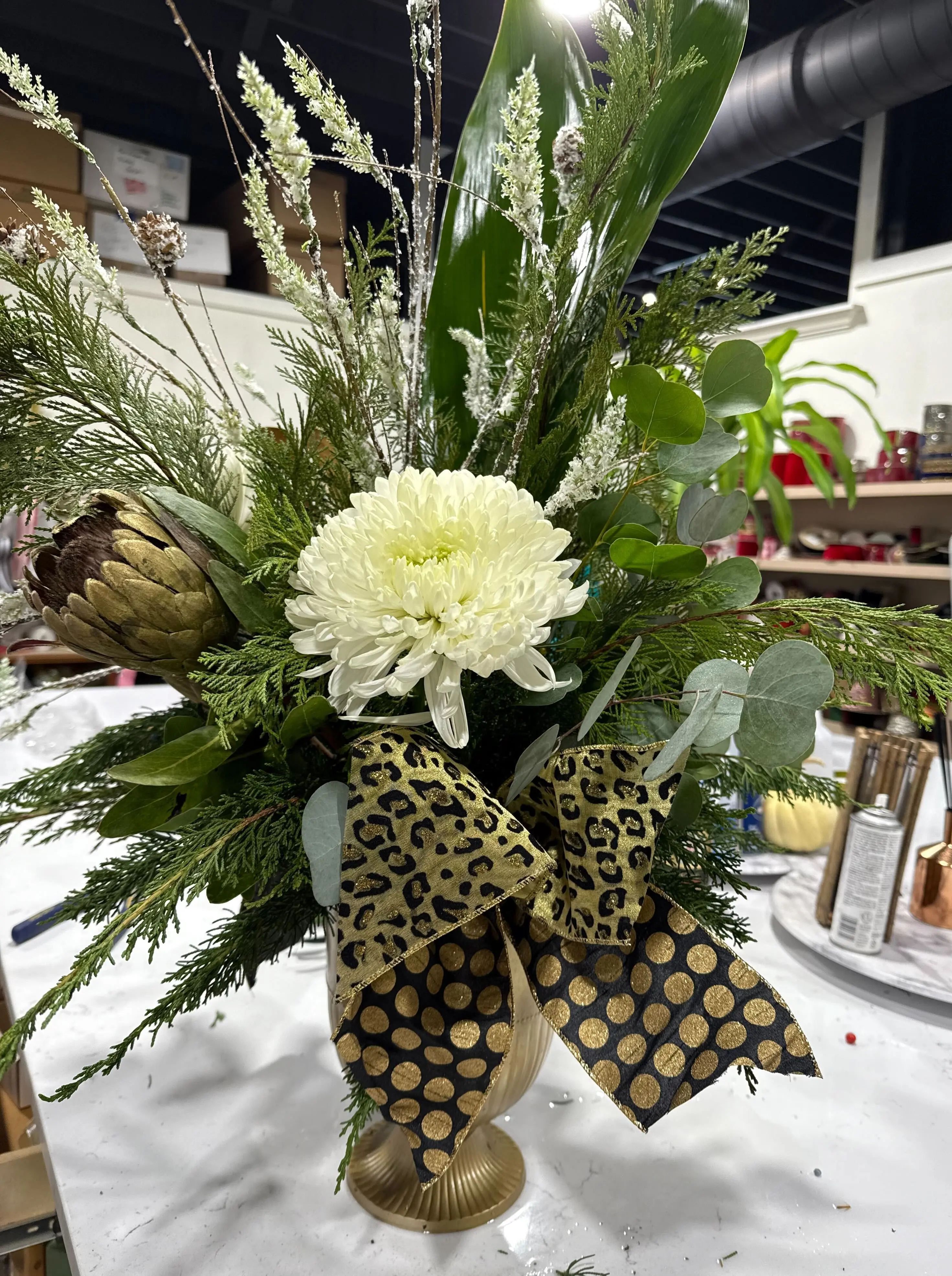 This bold elegant statement piece with a rich modern flair. Designed in a gold pedestal vase with lush greenery, Tea Leaves, Tinted Protea, Large Chrysanthemum and Designer Ribbon